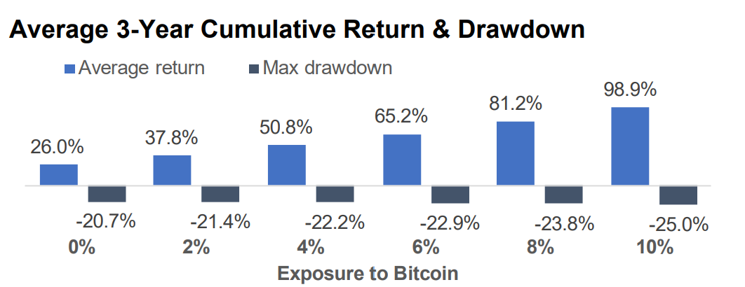 Source: AssetMark. Adding Bitcoin exposure to a 60/40 US portfolio. Average cumulative return and average maximum drawdown over rolling